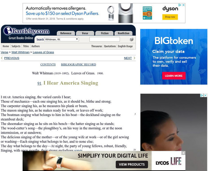 This site provides the online text for "I Hear America Singing" by Walt Whitman.