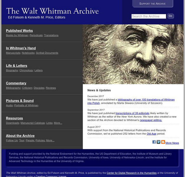 An extensive archive of works by and about Walt Whitman, from the University of Virginia. Includes his manuscripts (transcriptions and page images), published works, biography, criticism, images, teaching materials, and much more.