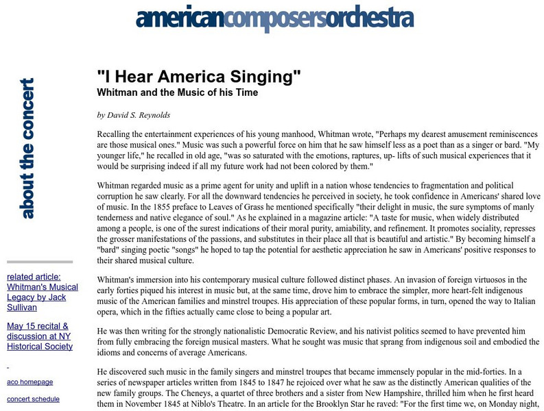 This I Hear America Singing site describes Whitman's views on music, the influence it had on his work, and a discussion of music in Whitman's time.
