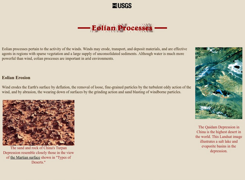 A site containing a description of basic Eolian (wind) processes and how they effect various types of terrain. Includes many pictures which illustrate the presented concepts.