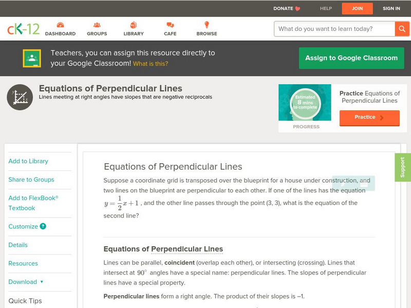 Ck 12: Algebra: Equations of Perpendicular Lines