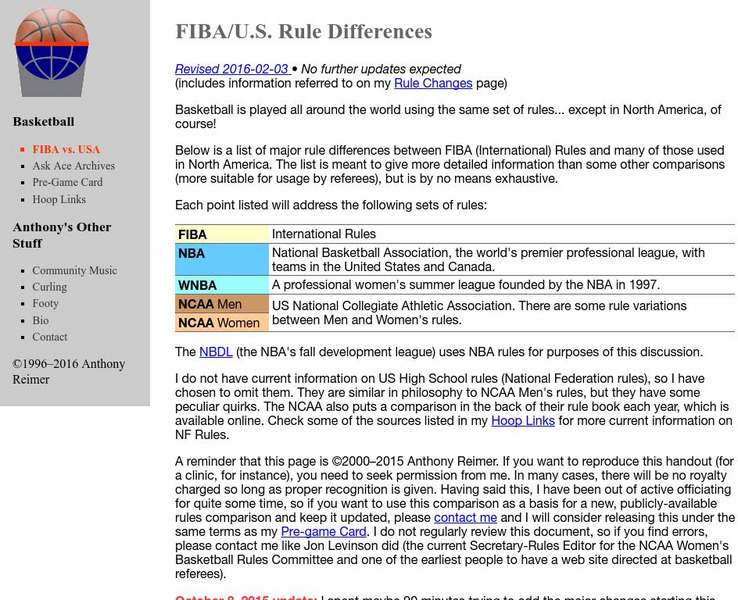 This offers some interesting comparisons between FIBA vs. U.S.A. as it relates to the rules of the game of basketball. There are also additional links to information about the rules of basketball.