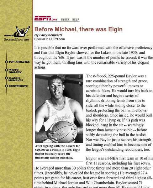 Read interesting biographical details on the life and career of Lakers great, Elgin Baylor, who was inducted into the Basketball Hall of Fame in 1976.