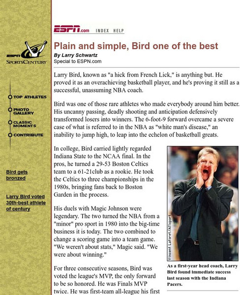 This site, from the NBA, provides an excellent career profile of former NBA basketball great Larry Bird. It offers links to other resource information.