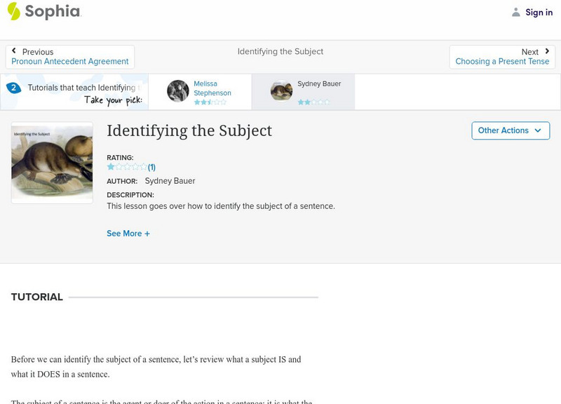 This lesson focuses on identifying the subject of sentences; it defines and discusses what a subject does. It explains how to locate the subject in various sentence constructions: subject-verb order, inverted sentences, passive voice,...