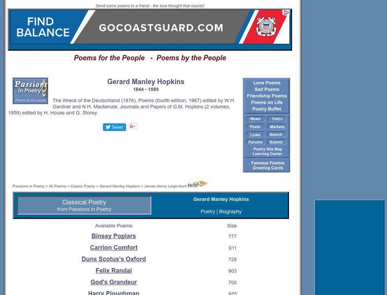 This site provides a brief biography of Victorian poet Gerard Manley Hopkins along with texts of many of his most famous poems.