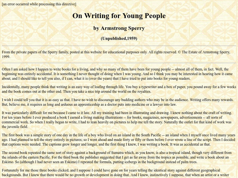 This unpublished document comes from the private papers of his family. Sperry addresses the issue of why he is a writer and why he writes for young people.