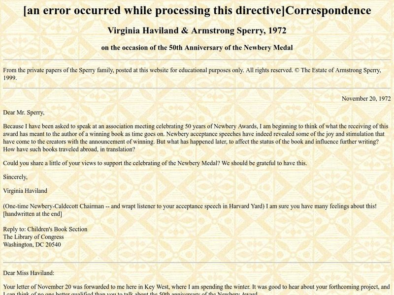 Two letters written by Virginia Haviland and Armstrong Sperry about the upcoming 50th anniversary of the Newbery Medal. Sperry reflects on what it means to be a Newbery winner 30 years after the fact.