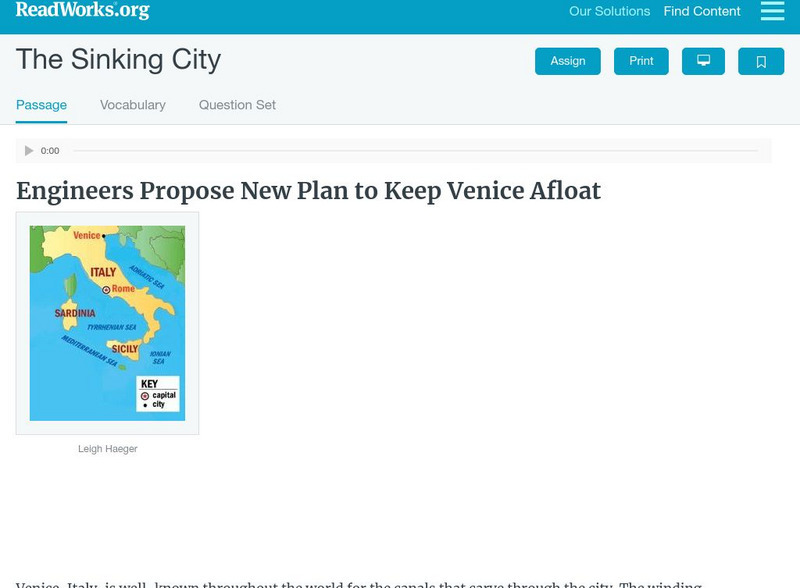 [Free Registration/Login Required] An informational text about an idea that might keep the city of Venice, Italy from sinking. A question sheet is available to help students build skills in reading comprehension.
