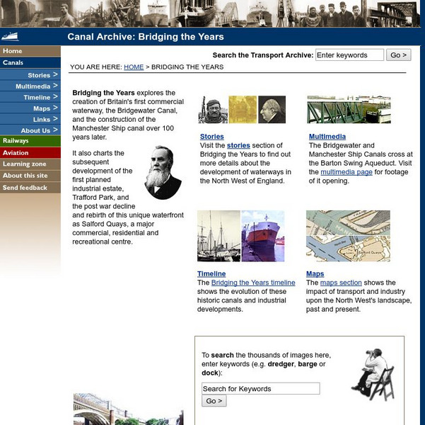 Bridging the Years explores the creation of Britain's first commercial waterway, the Bridgewater Canal, and the construction of the Manchester Ship canal over 100 years later. Stories, multimedia clips, a timeline, and numerous maps are...