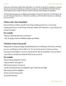 In this New Year writing instructional activity, students read the prompt that pertains to what they want to accomplish during the new year. Students write their resolutions.