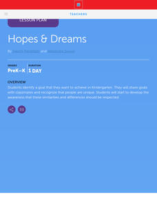 A lesson encourages mini scholars in setting goals. Peers share their hopes and dreams and discuss how each one adds to everyone's unique character. Class members draw themselves in a scene achieving a goal. A follow-up meeting allows...