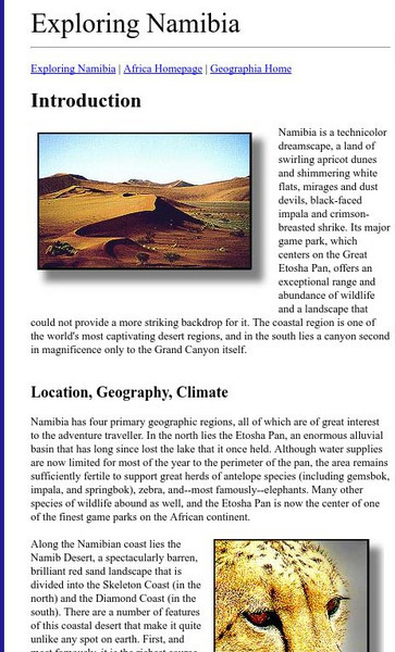 Brief description of Namibia, including people and geography, with an emphasis on parks and wildlife preserves; includes photographs.