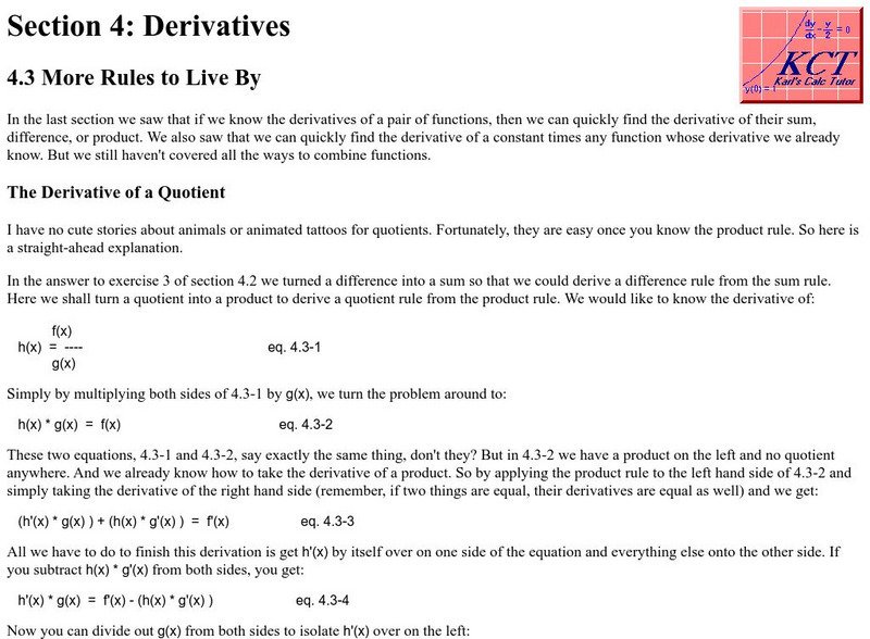This site provides a detailed overview of the quotient rule, as derived from the product rule. Content includes examples and exercises.