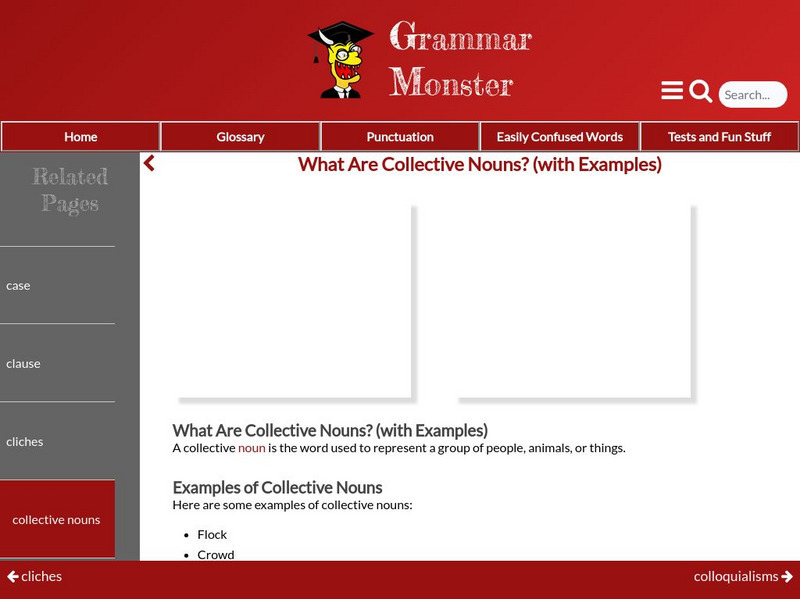 This site provides a resource related to collective nouns. Numerous examples are provided, along with an multiple-choice interactive quiz.