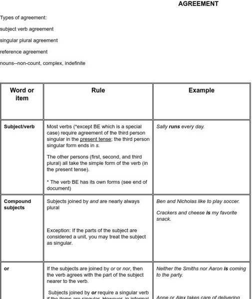 This entry provides the rules and examples for subject-verb agreement under a variety of situations such as with collective nouns, inverted subjects, compound subjects, indefinite pronoun subjects, and when a phrase or clause separates...