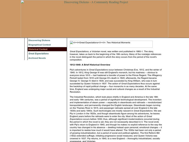 A helpful resource concerning the historical and cultural context of Charles Dickens' novel Great Expectations, both within the setting of the novel itself (1812-1840), and the novel's publication (1860-1861).