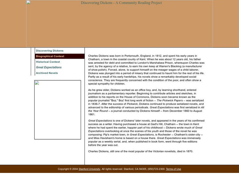 Professor Melani offers commentary and notes on Charles Dickens' life and on Great Expectations in particular. Site includes links to other Dickens resources.