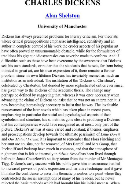 A thorough discussion of Dickens' major works. Content focuses on the "Dickens Institution" and the difficulty his work presents for literary criticism.