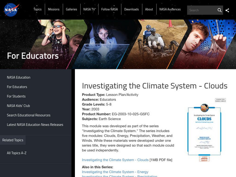 This detailed lesson plan provides six different activities to enhance student knowledge about clouds. Also find links to educator guides about other space topics. Includes PDF (requires Adobe Reader).