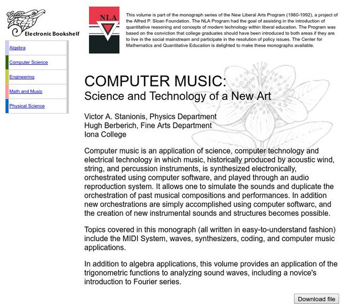 The downloadable monograph investigates computer music. Topics included are the MIDI system, waves, synthesizers, coding, and computer music applications.