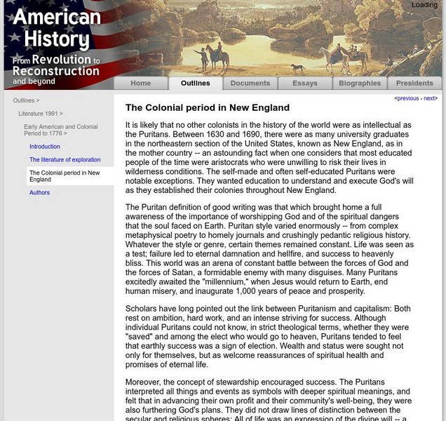 Background information about the literature of the Colonial period in American history. Discussions of capitalism, Puritan theology, and stewardship as found in the thought and literature of the period.