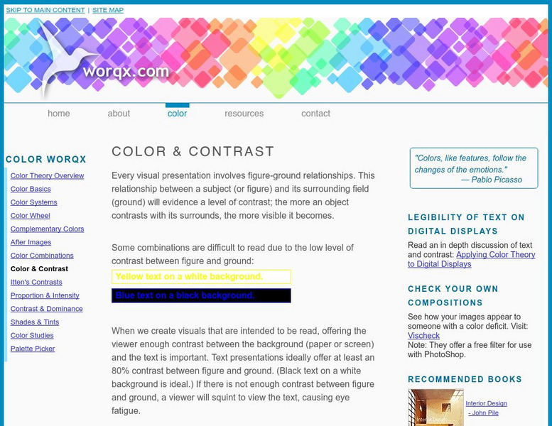 In an continuing overview of color and color theory, this site focuses on color and contrast. Topics covered in the overview include simultaneous contrast, sensitivity to colorblind deficiencies, choosing complementary colors, and more.