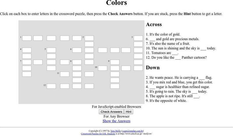 This site has a crossword that focuses on color words that the solver must supply. There's a hint button available as well.