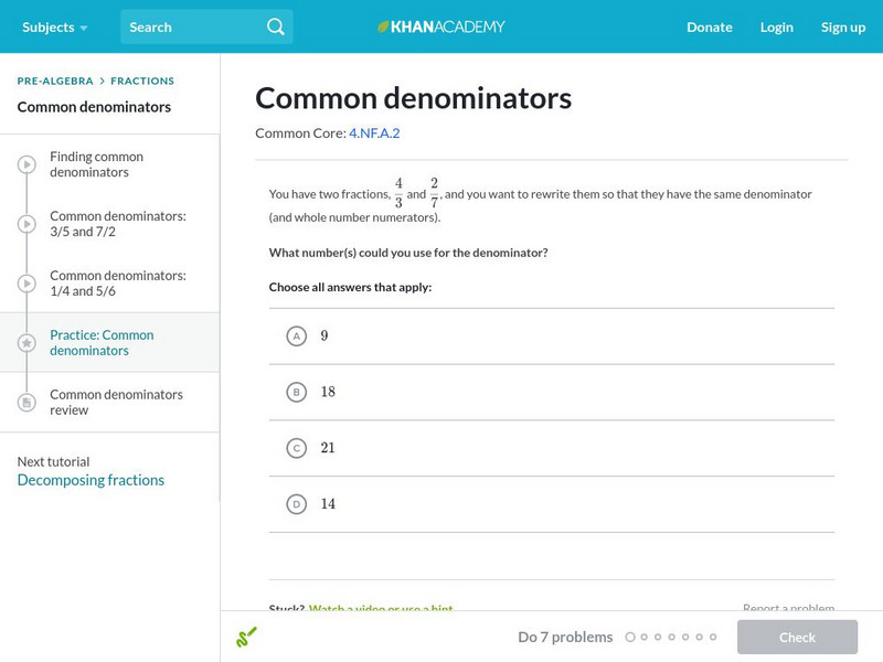 In this exercise, students practice finding common denominators. Students receive immediate feedback and have the opportunity to get hints and try questions repeatedly.