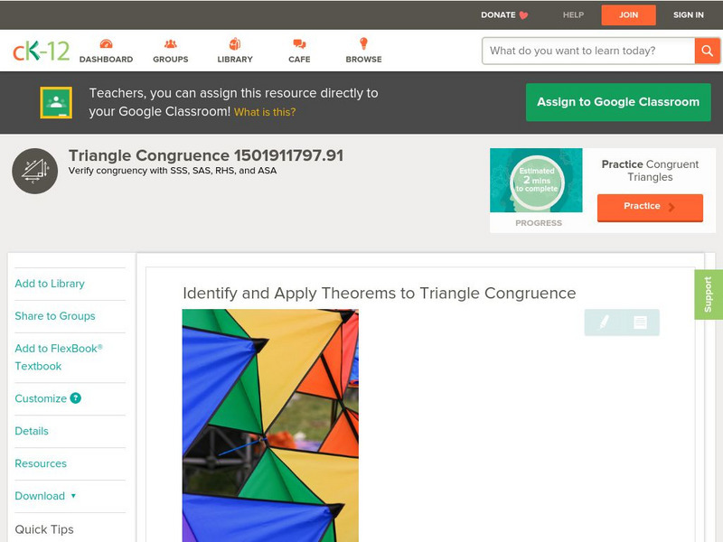 Use the triangle congruence criteria SSS, SAS, ASA, and AAS to determine that two triangles are congruent. Students receive immediate feedback and have the opportunity to try questions repeatedly, watch a video or receive hints.