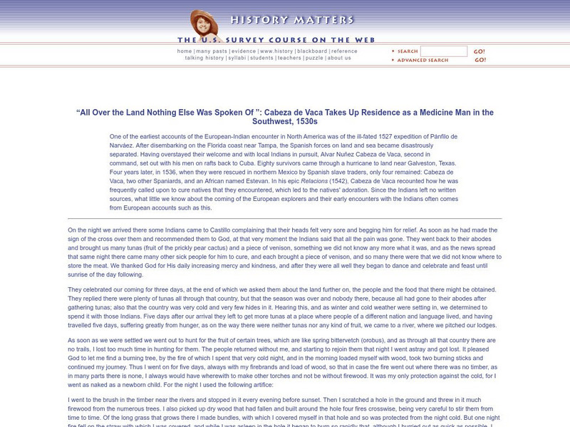 History Matters provides this fascinating account from Spanish conqquistador, Cabeza de Vaca, about his encounters with the varous Native Americans in the Southwest who came to him for medical attention.