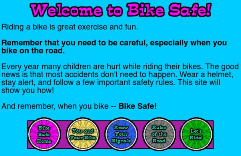 Harcourt School Publishers has provided terrific information regarding bike safety. This site suggests ways to safe proof your bike to prevent unwanted surprises while riding. Easy to follow links guide the visitor through hand signals...