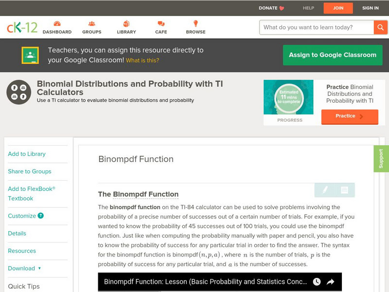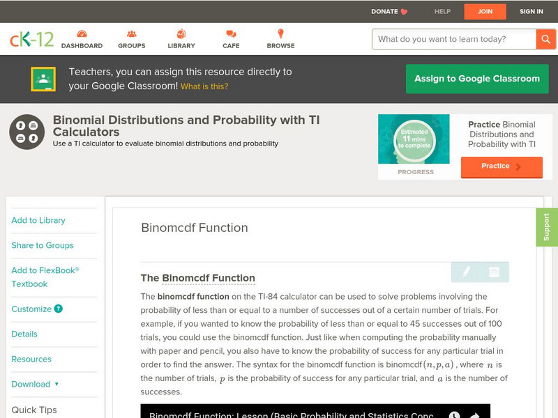 Ck 12: Probability: Binomcdf Function Grades 9 10