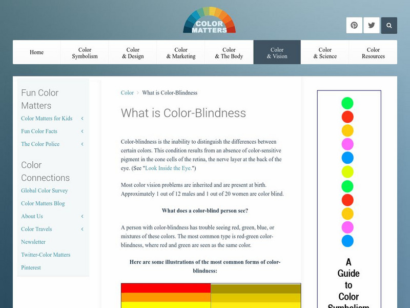 Page with facts about color blindness. Provides good questions and good feedback about this eye condition and what treatments are available.