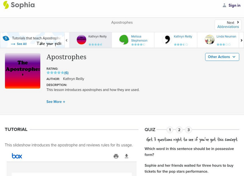 This slideshow lesson lists the uses of apostrophes: to show possession, create contractions, and identify missing letters. It explains the rules for each of these uses and provides examples.