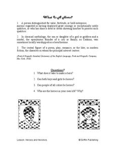 For this heroes worksheet, students read the three definitions of a hero and answer 4 essay and short answer questions about heroes.