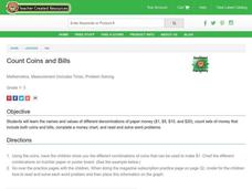 Students study the names and values of different denominations of paper money, count sets of money that include both coins and bills. They complete a money chart, read and solve word problems.