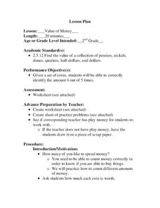 Second graders examine a collection of coins to discover their value. In this value of money lesson, 2nd graders identify the amount of money represented by each coin. Students use a worksheet to complete story problems involving...