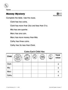 In this money worksheet, 2nd graders study and analyze 7 clues in order to complete a table on how many coins each child has in total value.