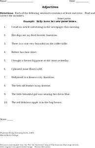 In this adjectives worksheet, students examine 10 sentences. Students find the errors in the adjective clause within the sentence and correct each error.