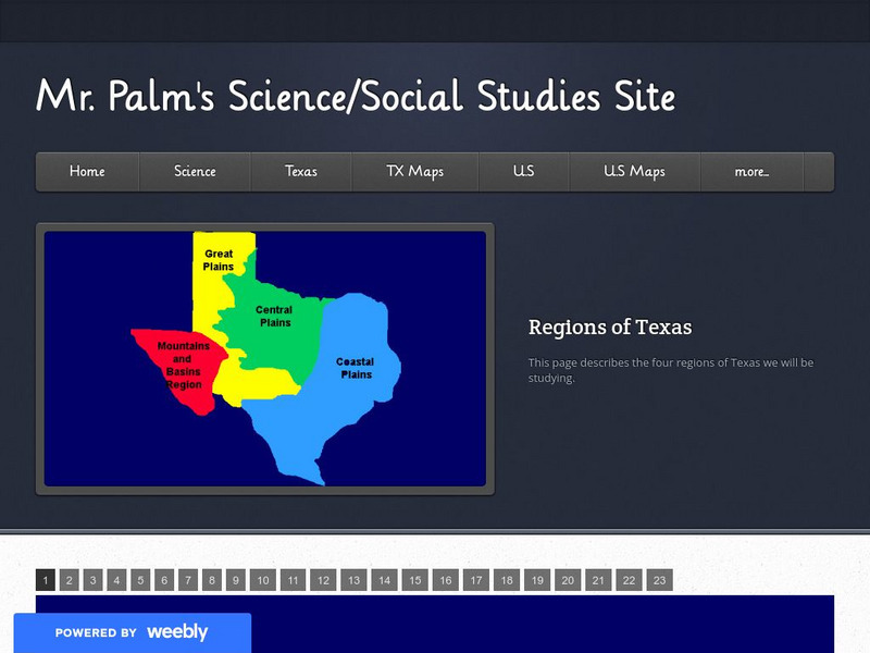The four major geographic regions of Texas are described in text and a slideshow, with a discussion of their landforms, climate, vegetation, animals, and resources.