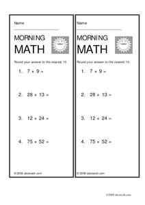 In this rounding learning exercise, students complete morning math sheets where they round addition problems of one and two digit numbers to the nearest 10. Students complete 4 problems total.