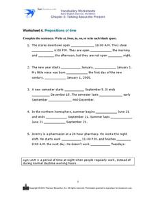 In this prepositions worksheet, students recognitions the prepositions at, from, in, on, and to. Students complete five sets of sentences with the correct preposition.