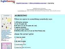 In this agreeing activity, students choose the correct option to respond to sentences. Students respond to 15 sentences total on this activity.