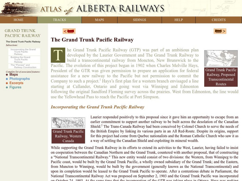 Presented by the University of Alberta, this resource contains information on the founding and development of The Grand Trunk Pacific Railway. The site also provides primary source resources in the the form of photographs, excerpts,...