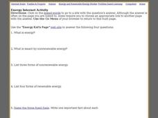 In this energy Internet activity worksheet, learners use links to websites to answer 16 questions about energy use. This page has numerous links to helpful web resources.