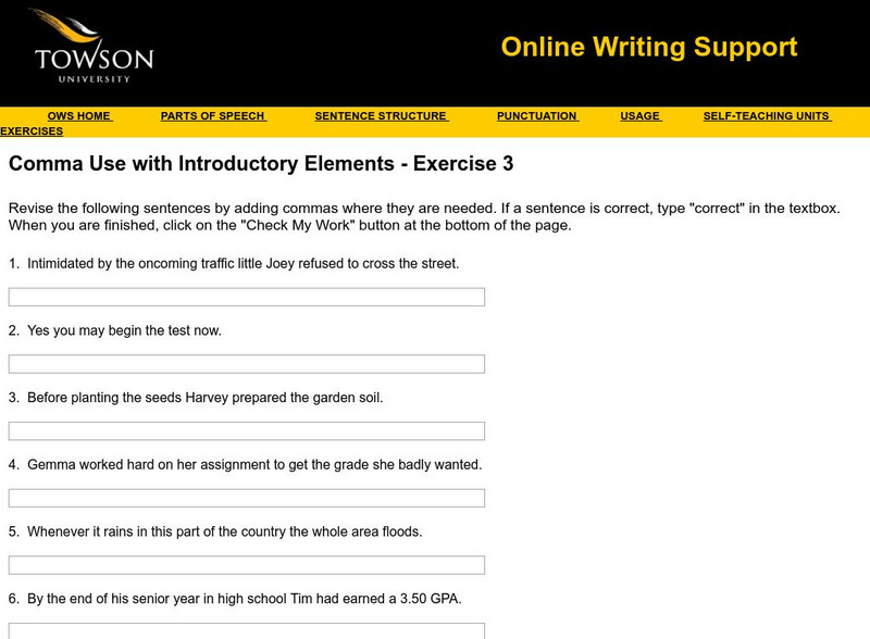 Towson University: Comma Use With Introductory Elements Exercise 3