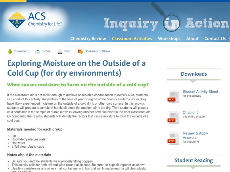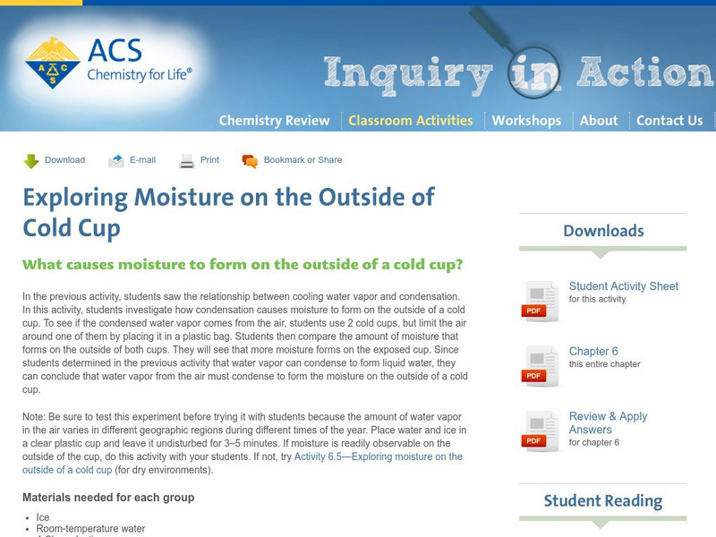 In this activity, students investigate how condensation causes moisture to form on the outside of a cold cup. To see if the condensed water vapor comes from the air, students use 2 cold cups, but limit the air around one of them by...