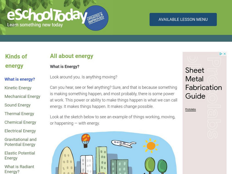 Explains different kinds of energy, covering kinetic, potential, gravitational, mechanical, sound, thermal, chemical, electrical, and radiant energy. Also looks at storage, transfer, and dissipation of energy. Includes a short...