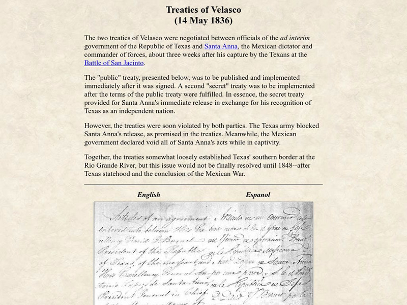 The "public" treaty of Velasco between the Republic of Texas and Santa Anna is presented in both English and Spanish on this PBS site. An explanation of the "secret" treaty is given also. Links to other websites.